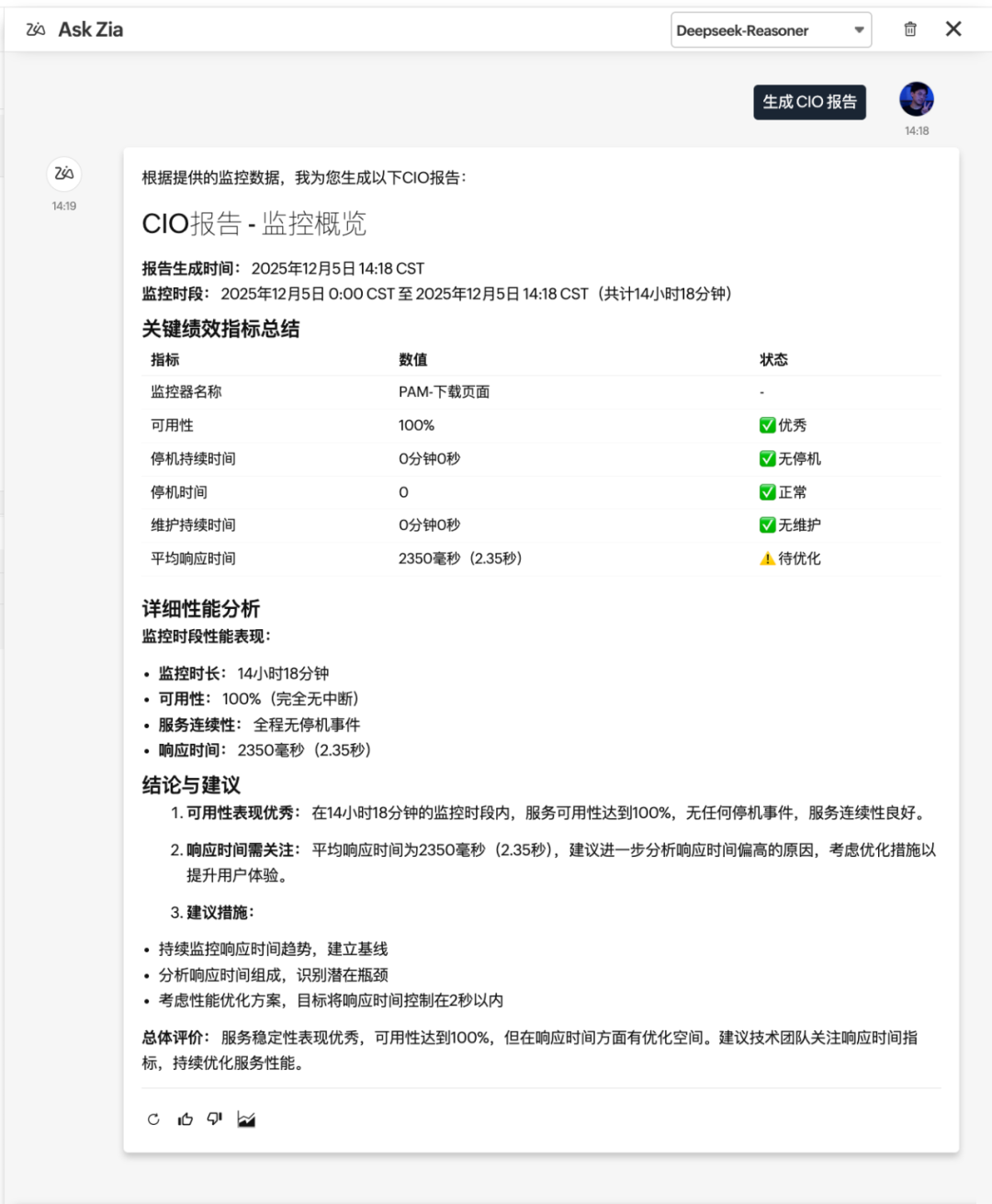 对于DevOps 工程师和企业管理者而言,实时、精准的报表是提升工作效率的关键。DevOps 工程师排查性能瓶颈时,可直接询问 “周末响应时间何时达到峰值?是否有共同规律?”,Ask Zia 会借助 DeepSeek 的强大分析能力,瞬间挖掘跨时段、跨地区的性能数据关联,定位峰值时段,提炼出地理位置、下载时间、连接时间、SSL 时间等关键影响因素,并给出针对性排查建议;CIO 需要全局系统视图时,只需下达 “生成 CIO 报告” 的指令,Zia 就会自动整合 SLA 数据,以结构化形式呈现系统可用性、故障分布、核心问题等关键信息,无需等待下属耗时整理,为决策提供实时数据支撑。