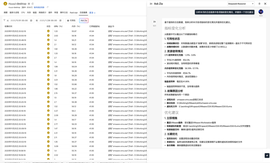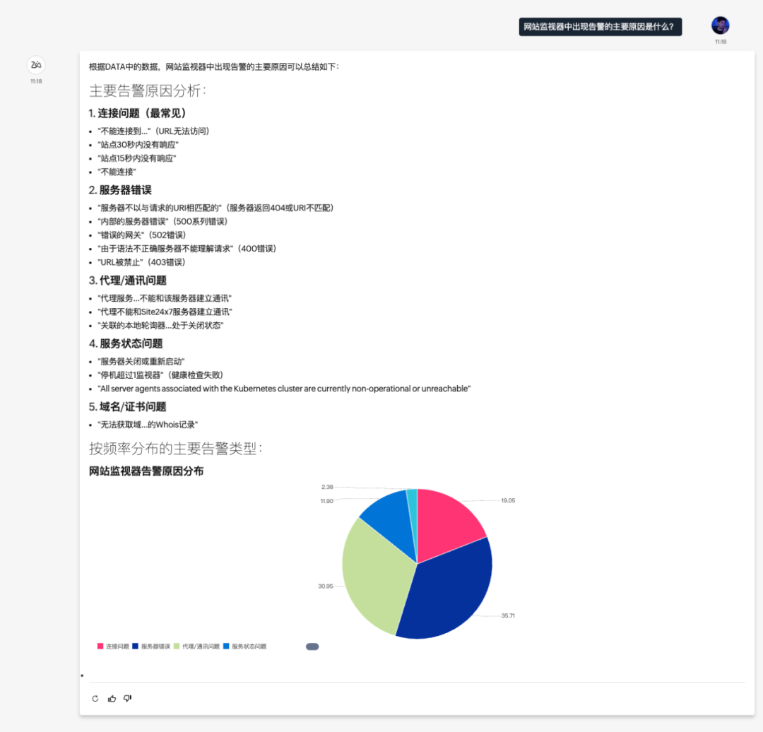 打破运维困局的关键,在于让AI 真正理解业务需求。集成 DeepSeek 后的 Ask Zia,延续了 “零门槛操作 + 高精度分析” 的核心优势,更在数据处理速度、异常诊断准确率、自然语言理解深度上实现全面提升。无需复杂查询语法、不用专业数据分析技能,运维人员、技术管理者只需用日常语言提出需求,就能快速获得结构化洞察、故障根源定位、智能优化建议,彻底摆脱手动筛选数据、熬夜整理报表的繁琐劳动,将更多精力聚焦于核心业务保障。