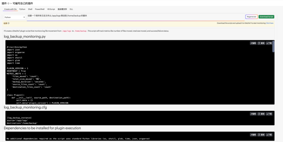 Ask Zia 将 AI 能力深度融入 IT 自动化流程,让非专业开发背景的运维人员也能高效完成脚本编写。在 Site24x7 的 “IT 自动化模板” 模块,选择服务器脚本或命令模板类型后,点击 “Zia Assistant”,用自然语言描述需求即可生成对应脚本。比如 “创建一个将所有日志文件从 /app/logs 移动到 /home/backup 的脚本”,集成 DeepSeek 后,Zia 能更精准理解自然语言指令,生成更规范、高效的 Shell 或 Batch 脚本,支持下载修改、再生优化,直接上传即可使用。这一功能大幅降低了自动化配置的技术门槛,提升 IT 自动化落地效率,让运维工作更具灵活性。