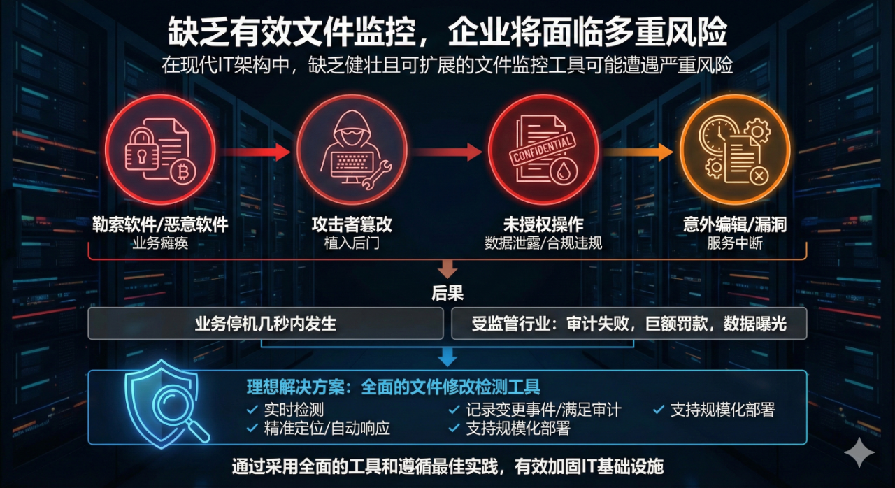 在现代IT 架构中,缺乏健壮且可扩展的文件监控工具,企业可能遭遇一系列严重风险: