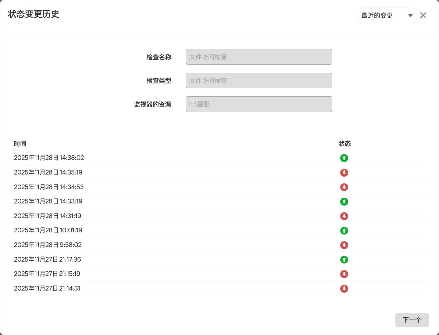 在配置文件设置中,添加“文件修改(最后修改时间)” 资源检查,设置唯一且描述性的检查名称,便于识别;