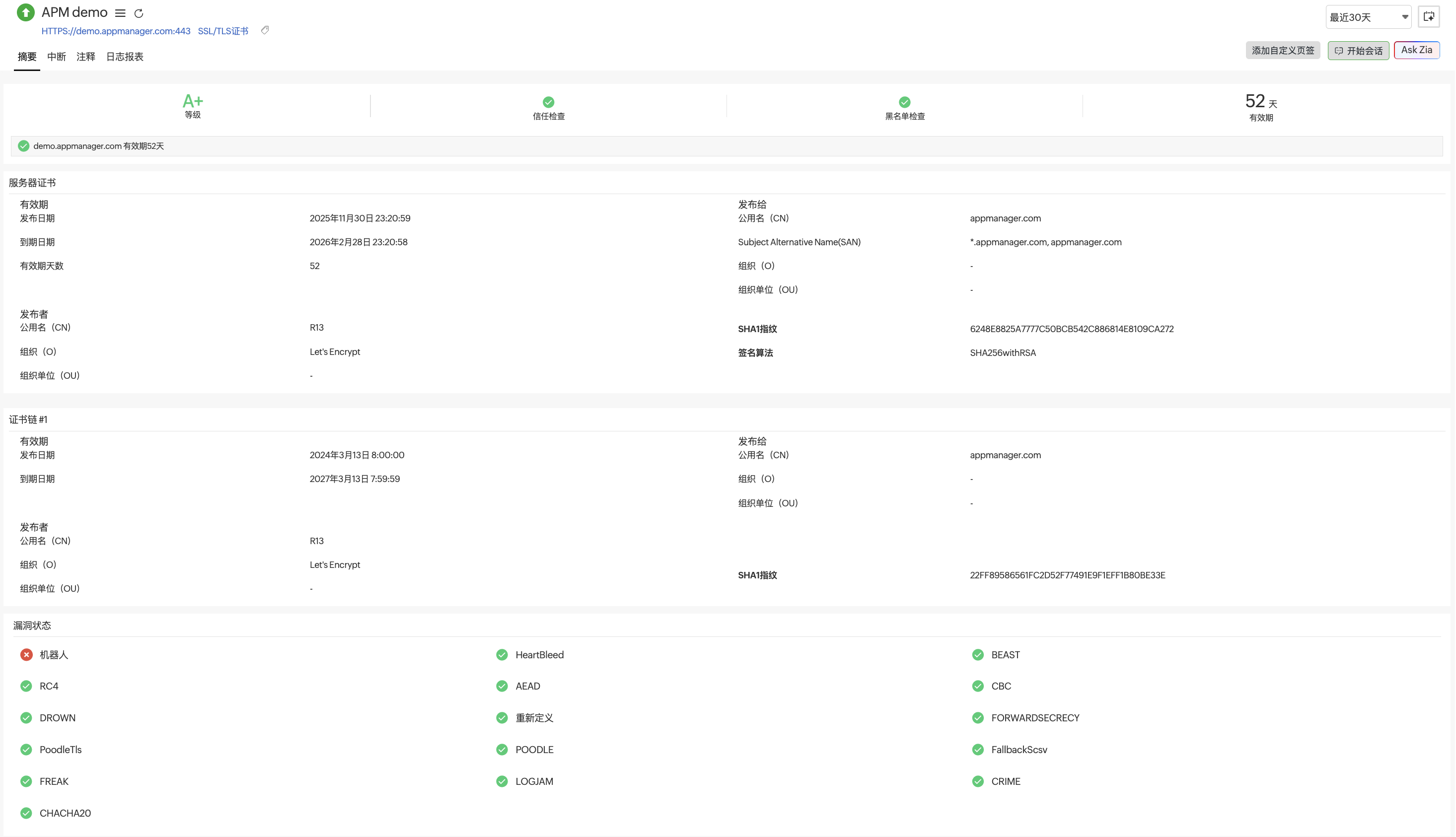 除了基础的连通性监测,Site24x7 更提供了超越证书有效期的深度安全防护。SSL 证书过期只是最显性的风险,而黑客劫持网站后替换恶意证书的隐蔽攻击,更可能导致用户数据泄露。Site24x7 的 SHA-1 指纹防篡改监测功能,能够实时比对证书指纹与原始记录,即便恶意证书的有效期完全合规,只要指纹信息不匹配,系统就会立即触发最高级别警报,帮助企业在用户数据被窃取前切断风险链路。