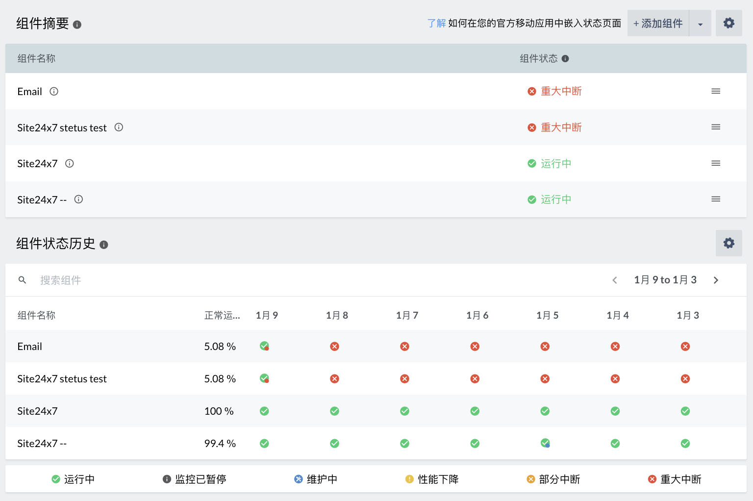 Site24x7 内置的 StatusIQ 功能恰好解决了这一痛点,能够一键生成公共状态页,当监控系统检测到 SSL 故障、访问超时等问题时,状态页会自动更新故障范围、影响人群和修复进度,第一时间向用户传递 “我们已知晓,正在处理” 的信号。据统计,这一功能能有效拦截 90% 的重复客服工单,减少用户焦虑,最大限度挽回品牌信任。