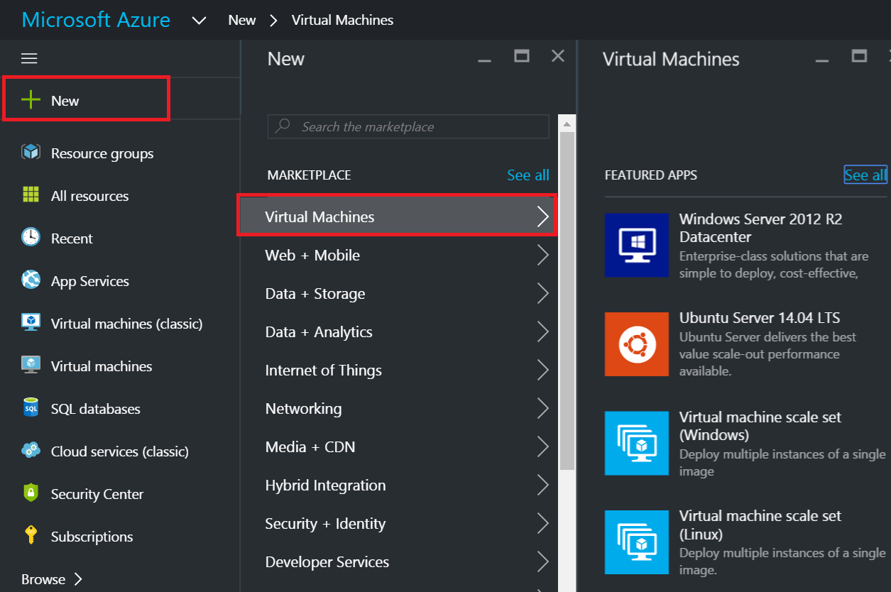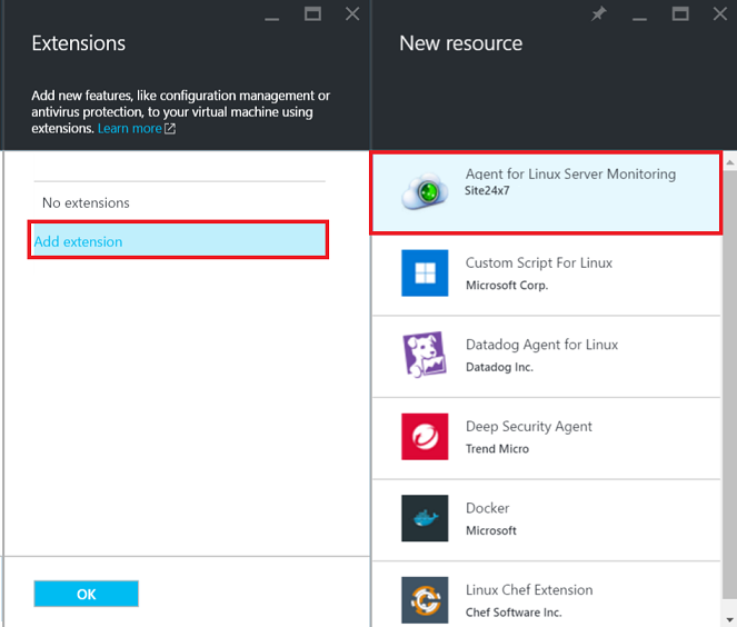 - 如果要创建新 VM,请导航至新建 > 虚拟机 > 选择列出的任何 Windows/Linux 服务器应用程序以添加 Windows/Linux 监视器,您还可以通过导航到资源组 > 添加 (+) > 选择列出的任何 Windows Server 应用来添加新 VM