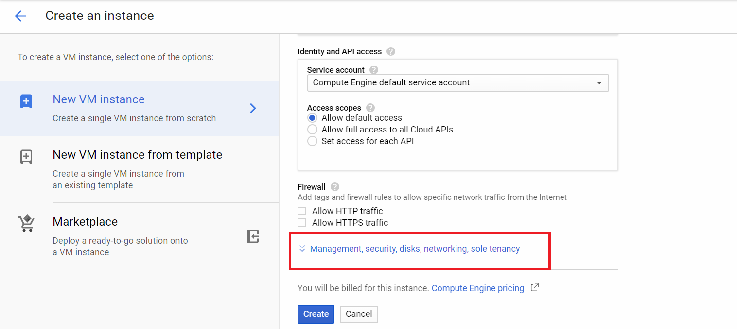 - 向下滚动并单击管理、安全、磁盘、网络、sole tenancy。