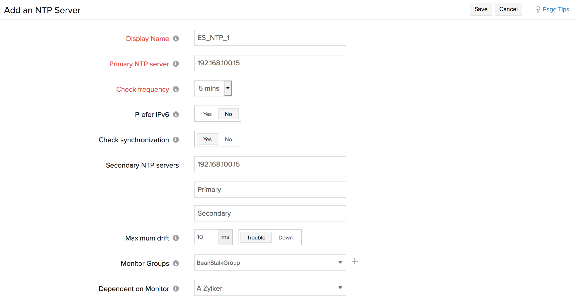 - 指定以下详细信息以添加 NTP 服务器监视器: