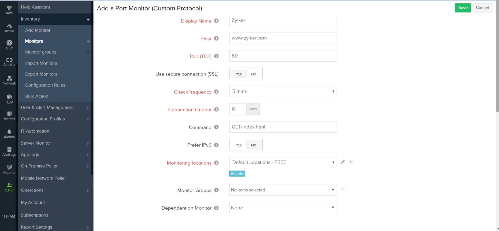 - 指定以下详细信息以添加端口(自定义协议)监视器: