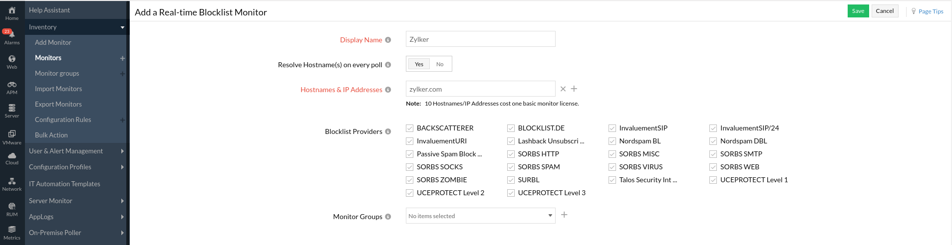 - 监视器组:您可以通过从下拉列表中选择相关监视器组将监视器与多个监视器组关联。这允许对监视器进行逻辑分组。