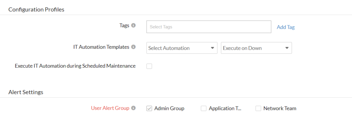 - IT 自动化:选择当网站关闭/故障/启动/任何状态更改/任何属性更改时要执行的自动化。当状态发生变化并提醒选定的用户组时,将执行定义的操作。