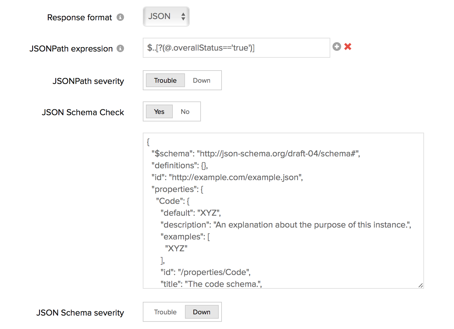 $..* 选择所有属性及其值。 状态为 Up。响应 JSON 具有多个属性。如果 JSON 响应中没有属性,则监视器将报告中断。