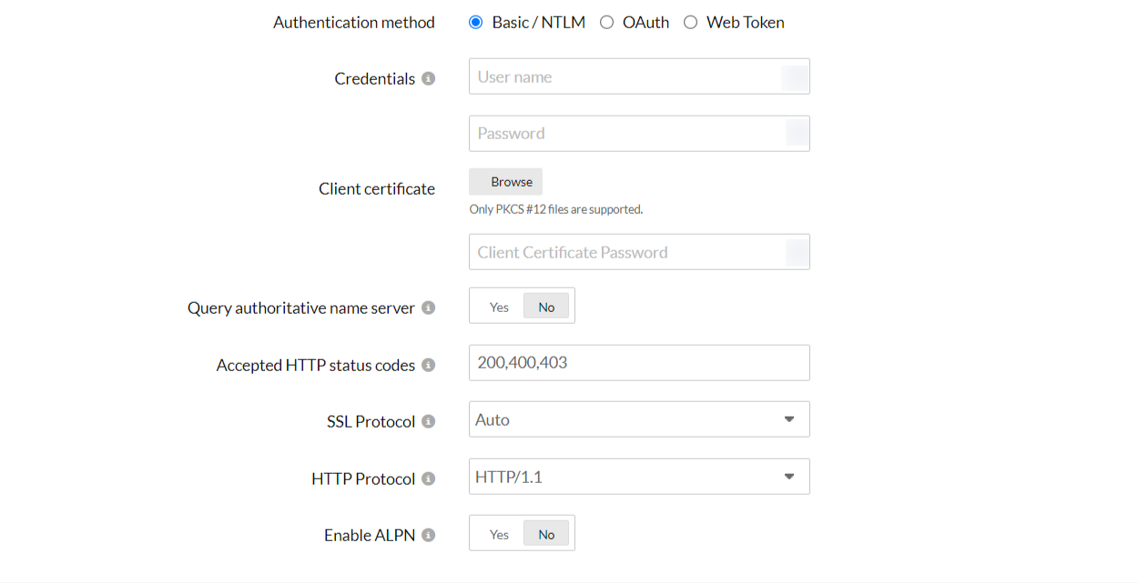 - 启用 ALPN:启用 ALPN 以确保仅将支持的的应用程序协议作为 TLS 握手的一部分发送,并确保减少往返时间。默认情况下,它将设置为是。本地部署轮询器不支持启用 ALPN 选项。我们将在下一次更新中扩展支持。