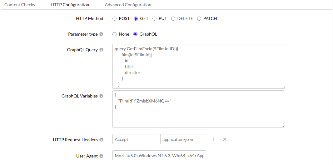 在 GET 方法中,将获取整个 HTML 响应并检查您配置的关键字是否存在。 - 参数类型:如果您希望定义要发送到端点的 GraphQL 查询,请选择 GraphQL。
