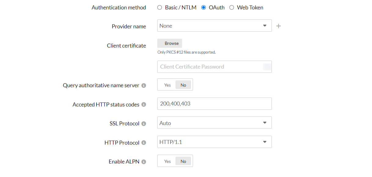 - OAuth:如果您正在监视由 OAuth 框架保护的资源,请选择 OAuth 单选按钮。