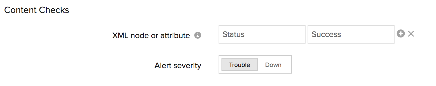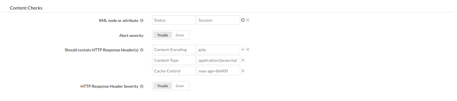 - 应包含 HTTP 响应标头:为您的 HTTP 请求输入所需的响应标头和值,并验证 HTTP 标头是否存在或值是否与所需的响应匹配。在检查失败期间触发故障或停机告警。