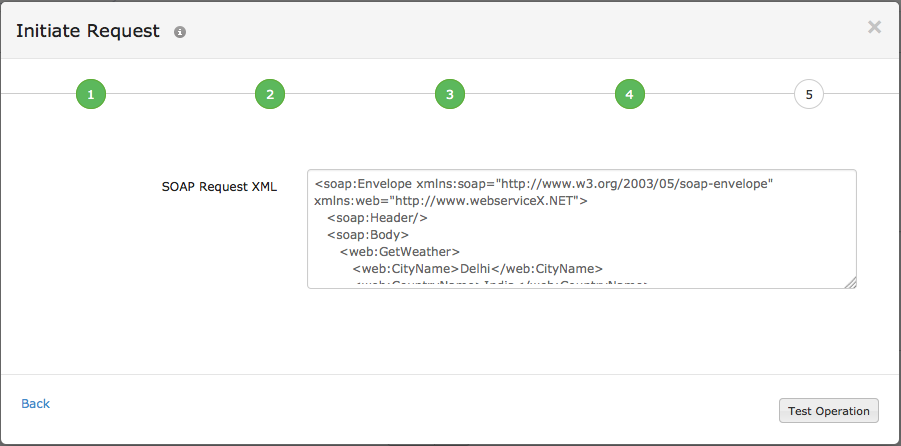 - 发起请求:单击测试操作 以验证 SOAP 请求 XML。