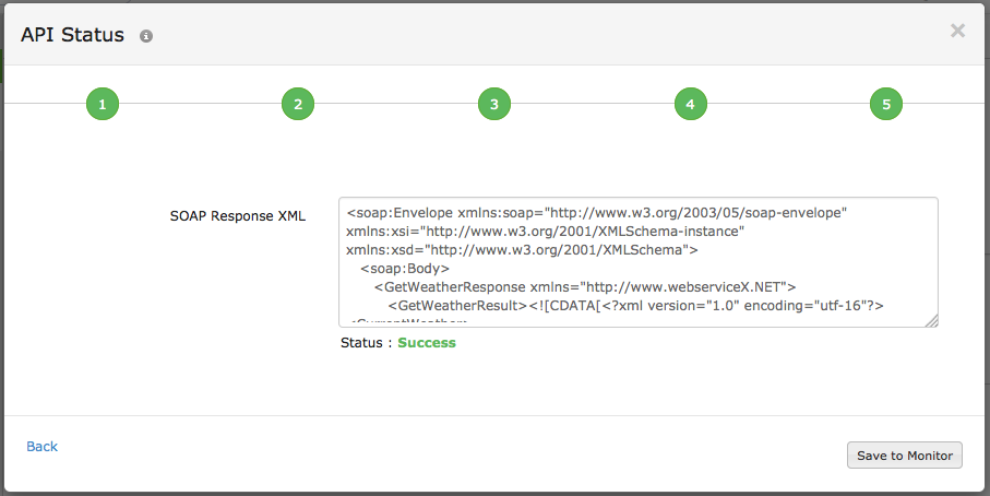 - API 状态:在成功验证 SOAP 响应 XML 时,单击 保存到监视器 以将请求 XML 数据添加到请求正文。