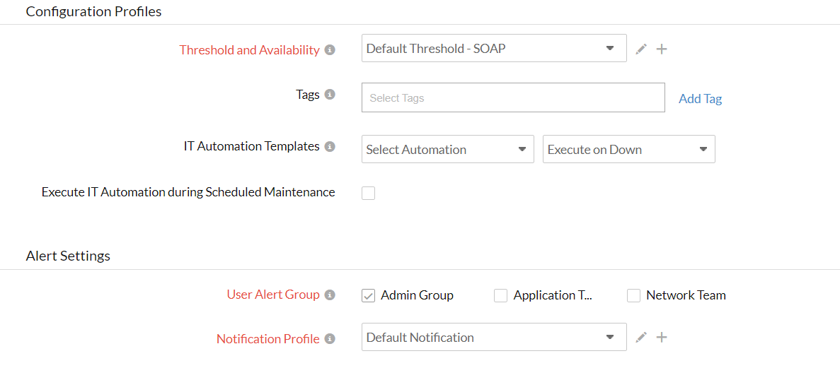 - 阈值和可用性:从下拉列表中选择阈值配置文件或选择可用的默认阈值集,并在资源超过配置的阈值和可用性时收到通知。