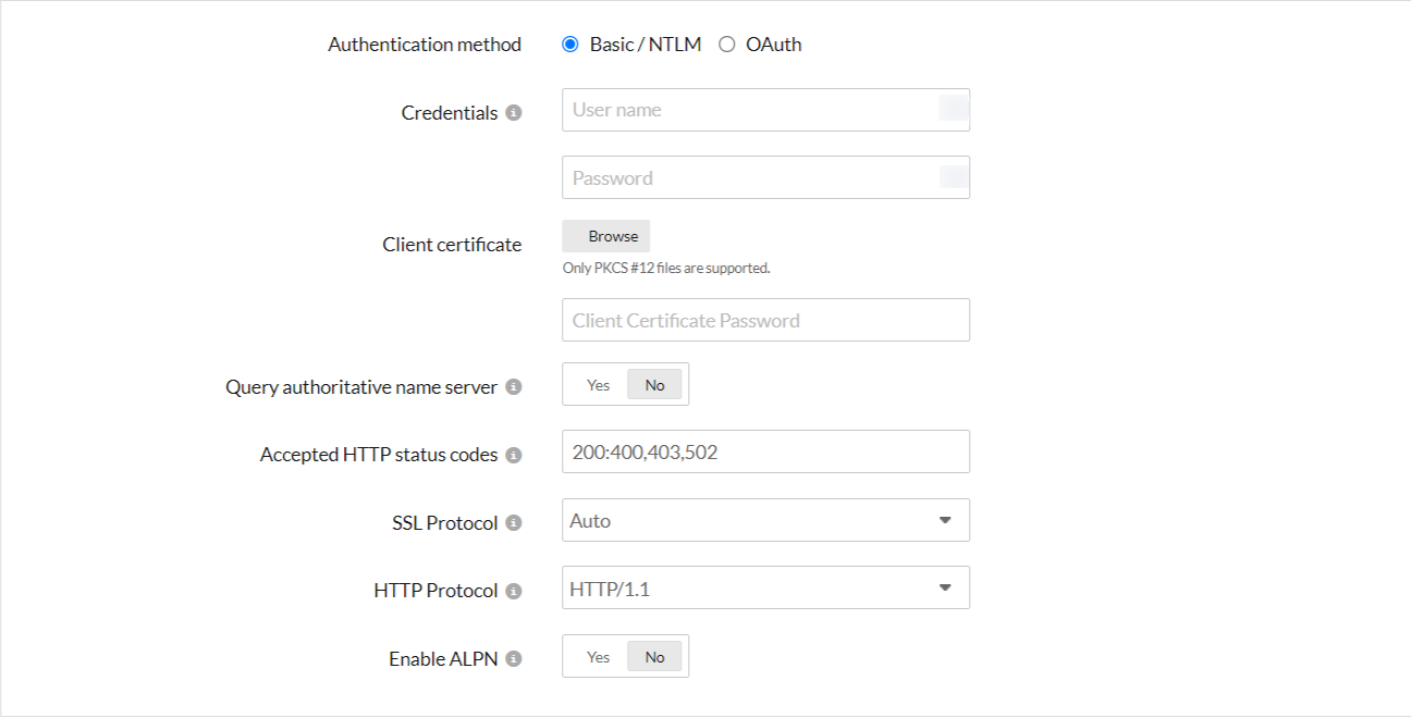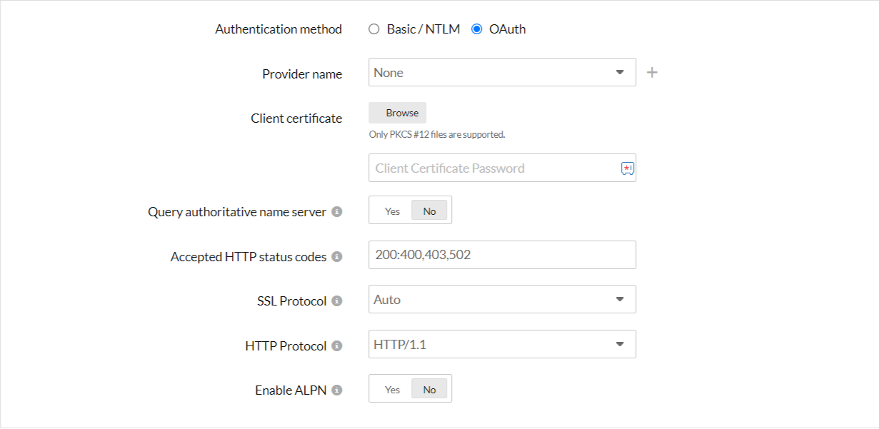 - 启用 ALPN:启用 ALPN 以确保仅将支持的的应用程序协议作为 TLS 握手的一部分发送,并确保减少往返时间。默认情况下,它将设置为是。本地部署轮询器不支持启用 ALPN 选项。我们将在下一次更新中扩展支持。
