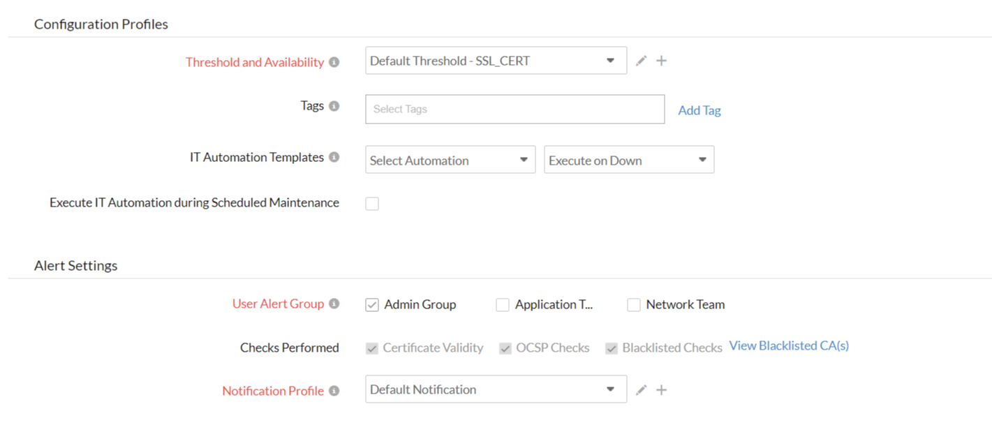 检测 SSL/TLS 证书链时,才能执行 OCSP 检查 。- 通知配置文件:从下拉列表中选择通知配置文件或选择可用的默认配置文件。通知配置文件有助于配置在停机时需要通知的时间和人员。在通知配置文件表单中,您只能 自定义 用于停机/故障告警的电子邮件模板。默认情况下,其他参数将被禁用。