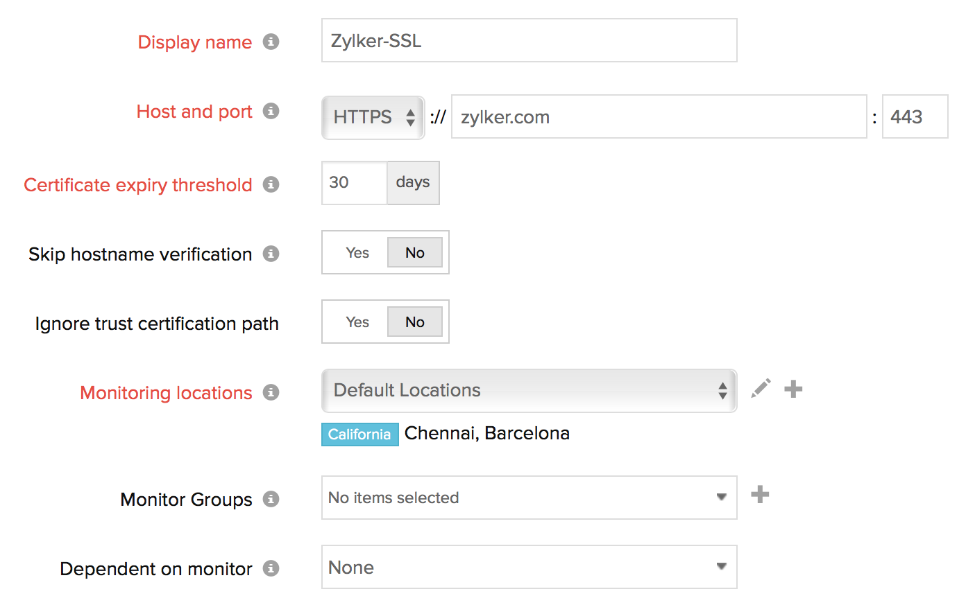 - 证书过期阈值:在证书过期前这么多天发出通知。当超出此阈值时,您的监视器就会出现问题。
