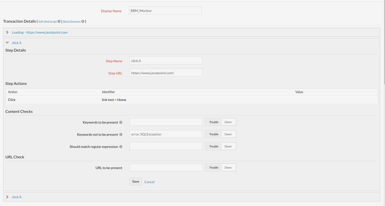 - 保存 Web 脚本后,您可以根据需要进行必要的配置和阈值更改。单击保存按钮以创建 Web 事务(浏览器)监视器的克隆。