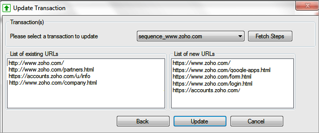 - 从下拉列表中选择要更新的事务,然后单击获取步骤。这将列出事务中的现有 URL。