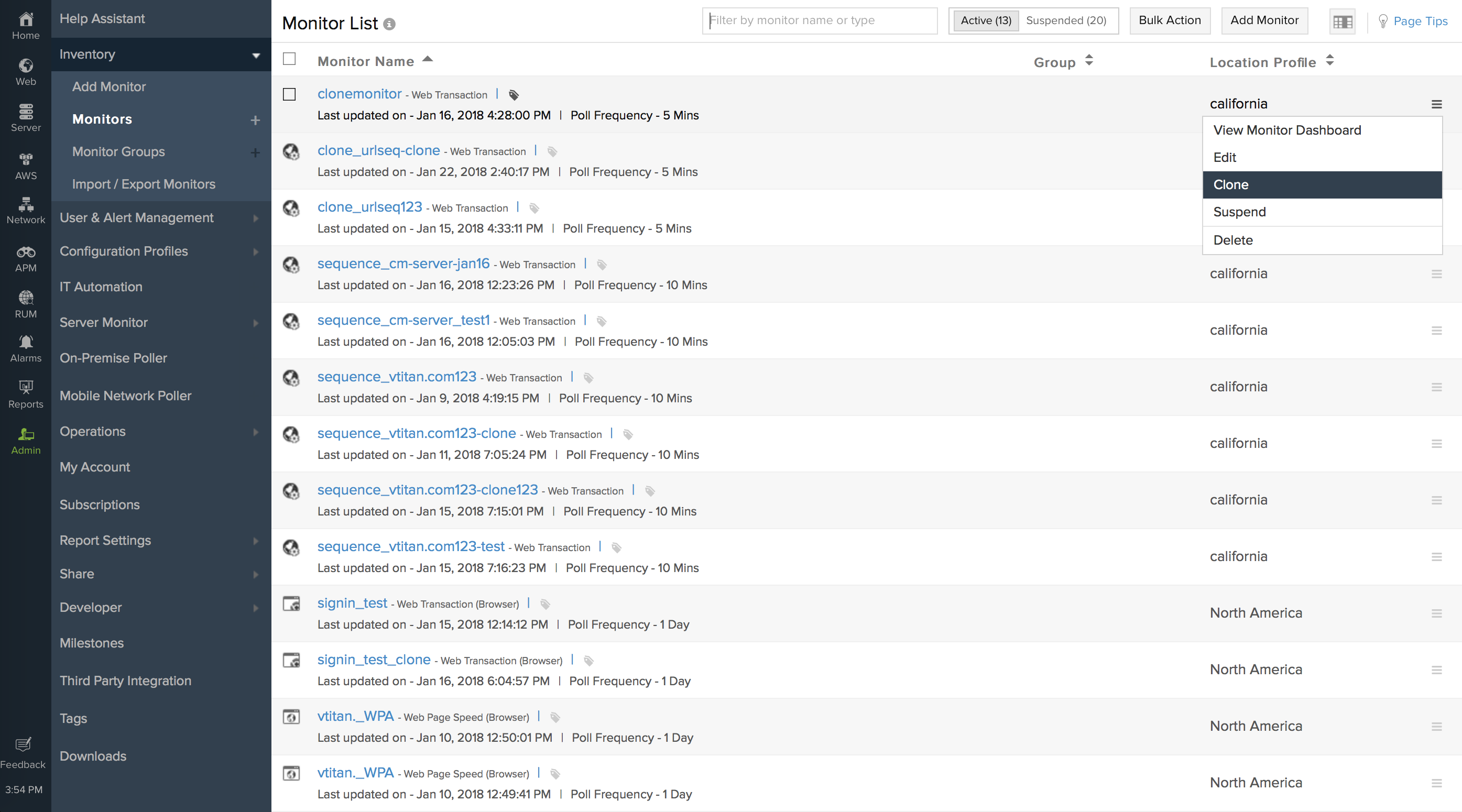 - 从监视器列表中选择要克隆的 Web 事务监视器。现在,将鼠标悬停在