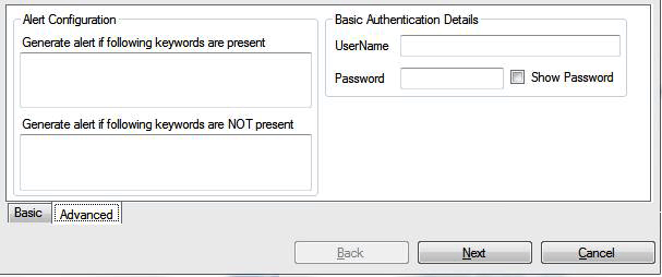 - 高级:输入内容匹配和基本身份验证详细信息的告警配置。