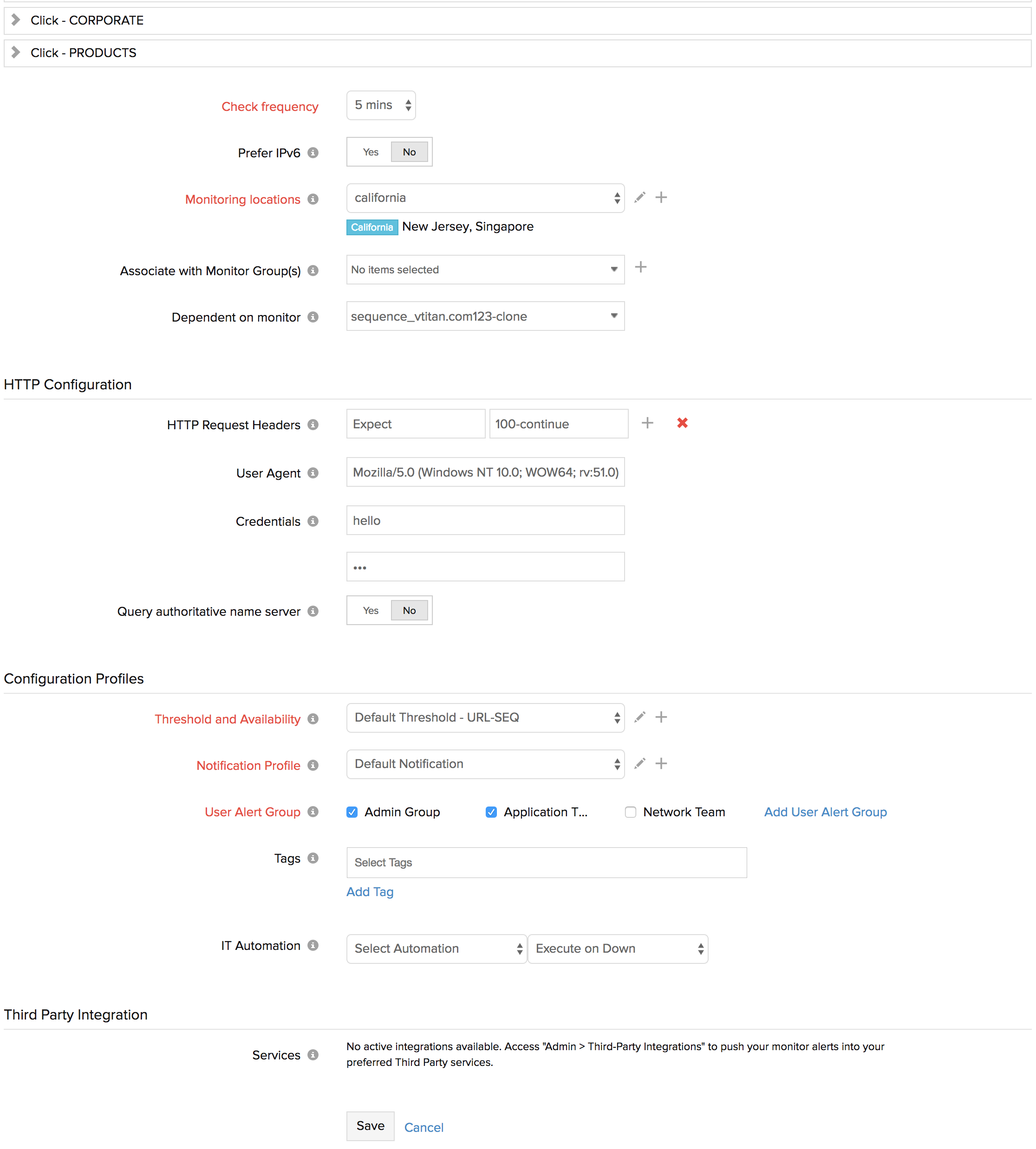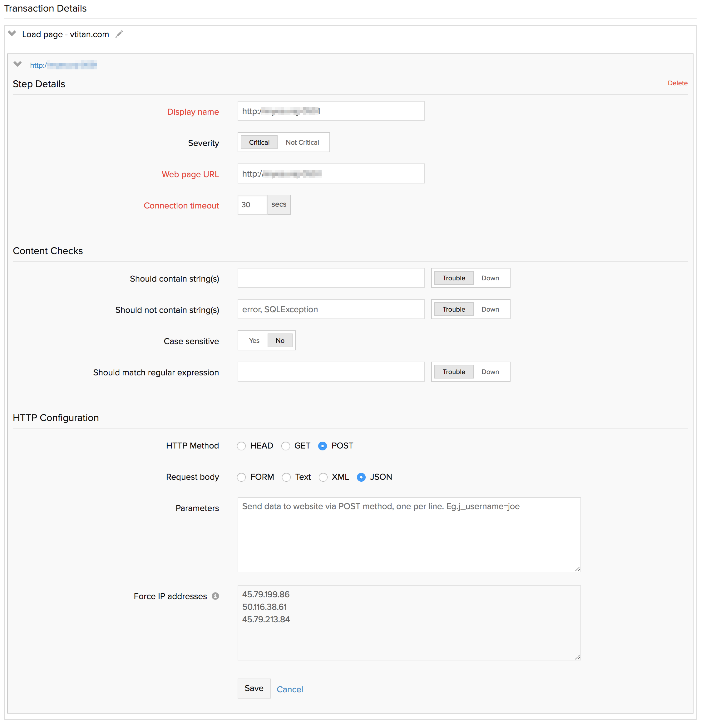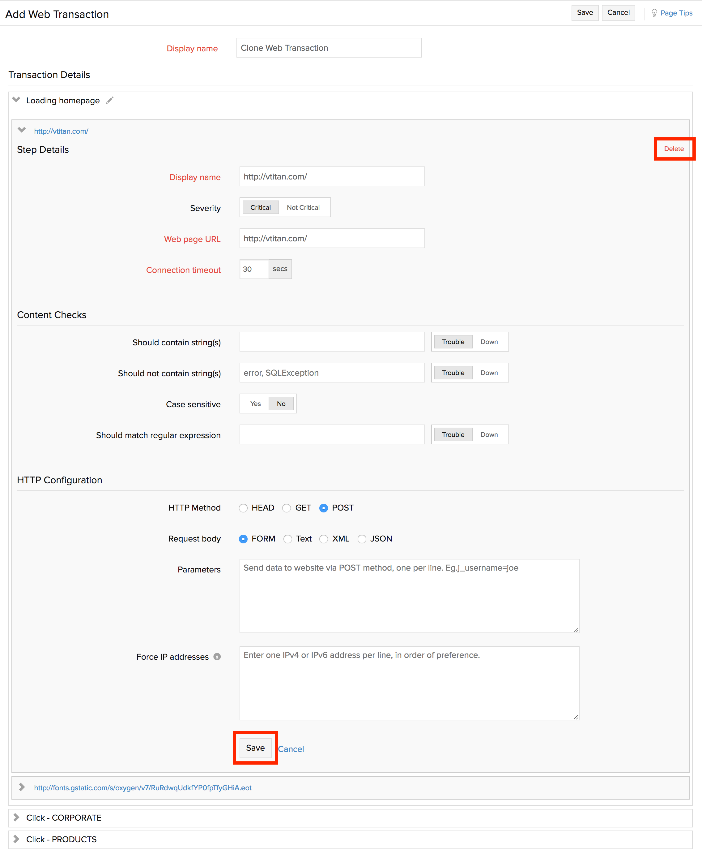 - 现在您将被重定向到克隆监视器的添加 Web 事务页面。您可以在每个事务步骤下对各个 URL 的步骤详细信息、内容检查和 HTTP 配置设置进行必要的更改。您必须单独保存单个事务。您还可以在事务下删除某个步骤 URL。