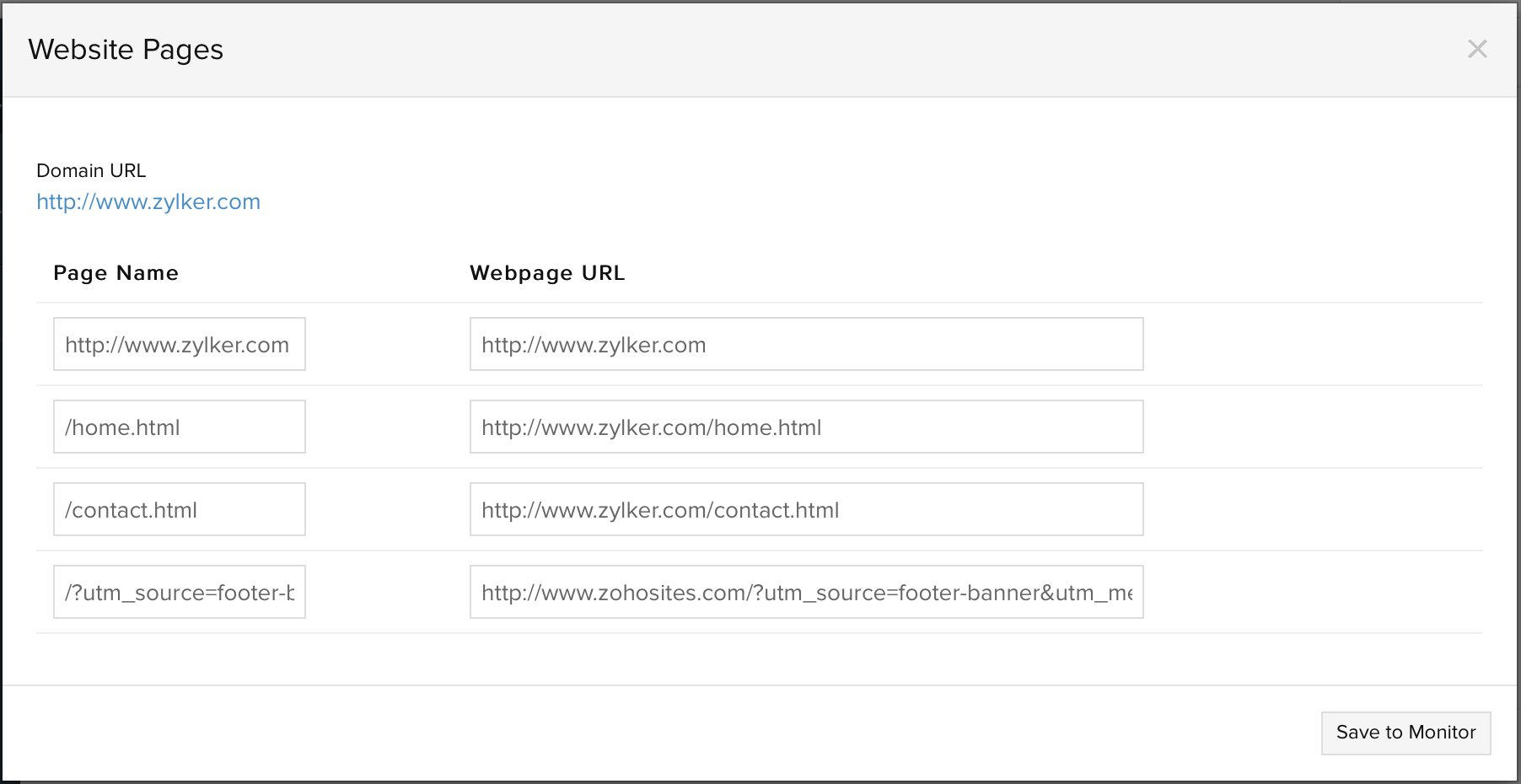 - 向导会自动选择并列出域中的前 10 个网页。您可以根据需要在此列表中添加或删除任何网页 URL。完成后,提交保存到监视器按钮。