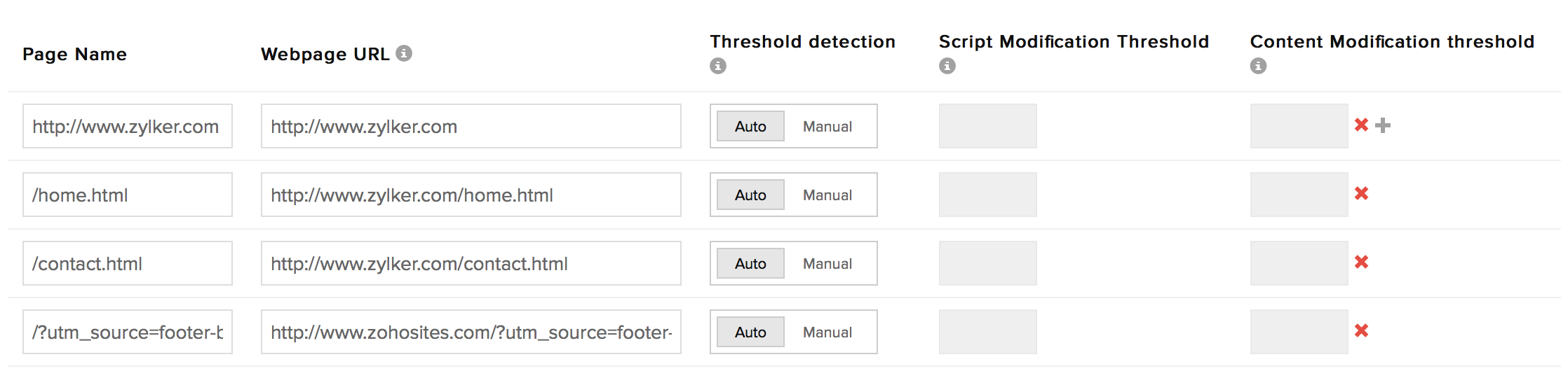 默认情况下,阈值检测设置为“自动”模式。Site24x7 将在设置后通过连续检查网页两次来自动检测和更新脚本和内容修改阈值。在“手动”模式下,您可以自定义输入值来定义阈值限制。