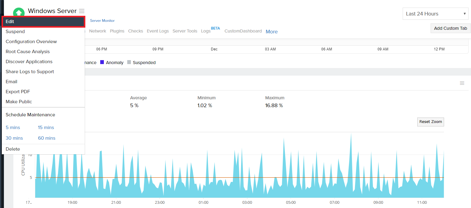 - 登录到 Site24x7 并转到服务器>服务器监视器>服务器> 单击您要编辑的 Windows 服务器监视器。