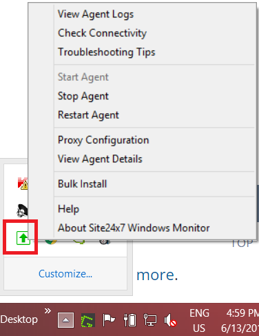 除了以上四个,还有托盘图标(作为进程运行)和代理日志({安装目录}> Site24x7 > WinAgent > Monitoring > Logs)。该代理是本机 C/C++ 可执行文件,作为 Site24x7 Windows 代理服务或 MonitoringAgent.exe 进程运行。