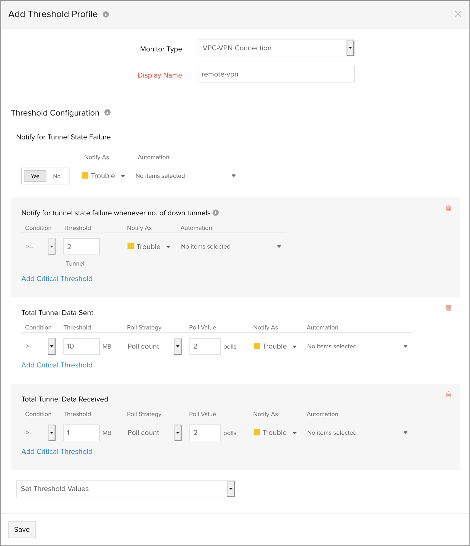 显示名称旁边的图标 >编辑 - 您会发现阈值配置文件(默认阈值 - VPC-VPN 连接)已分配给阈值和可用性字段,单击铅笔图标,配置新阈值并单击保存。