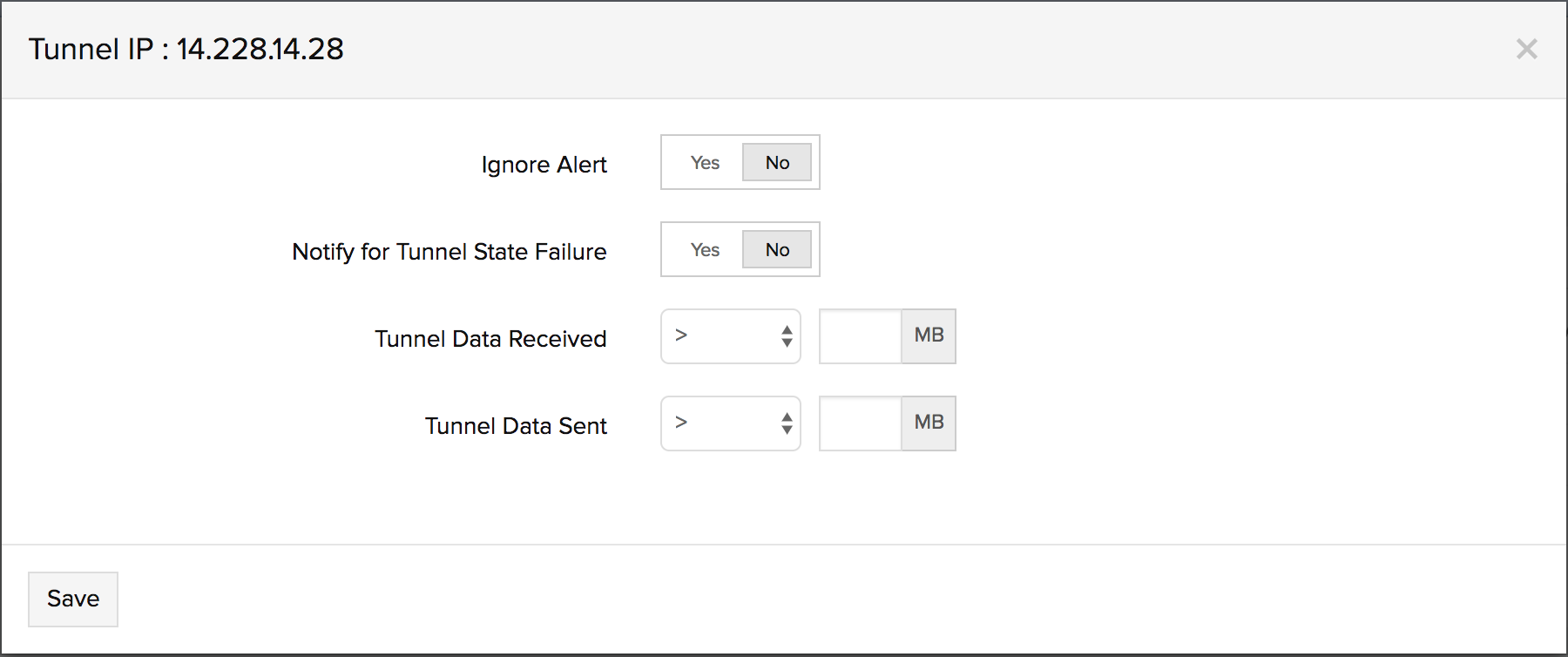 - 单击铅笔图标以配置指标数据的阈值 - 隧道状态、隧道数据输入和隧道数据输出(基于每个隧道),然后单击保存。您还可以通过单击阈值配置选项为所有关联的 VPN 端点(隧道)批量配置阈值。