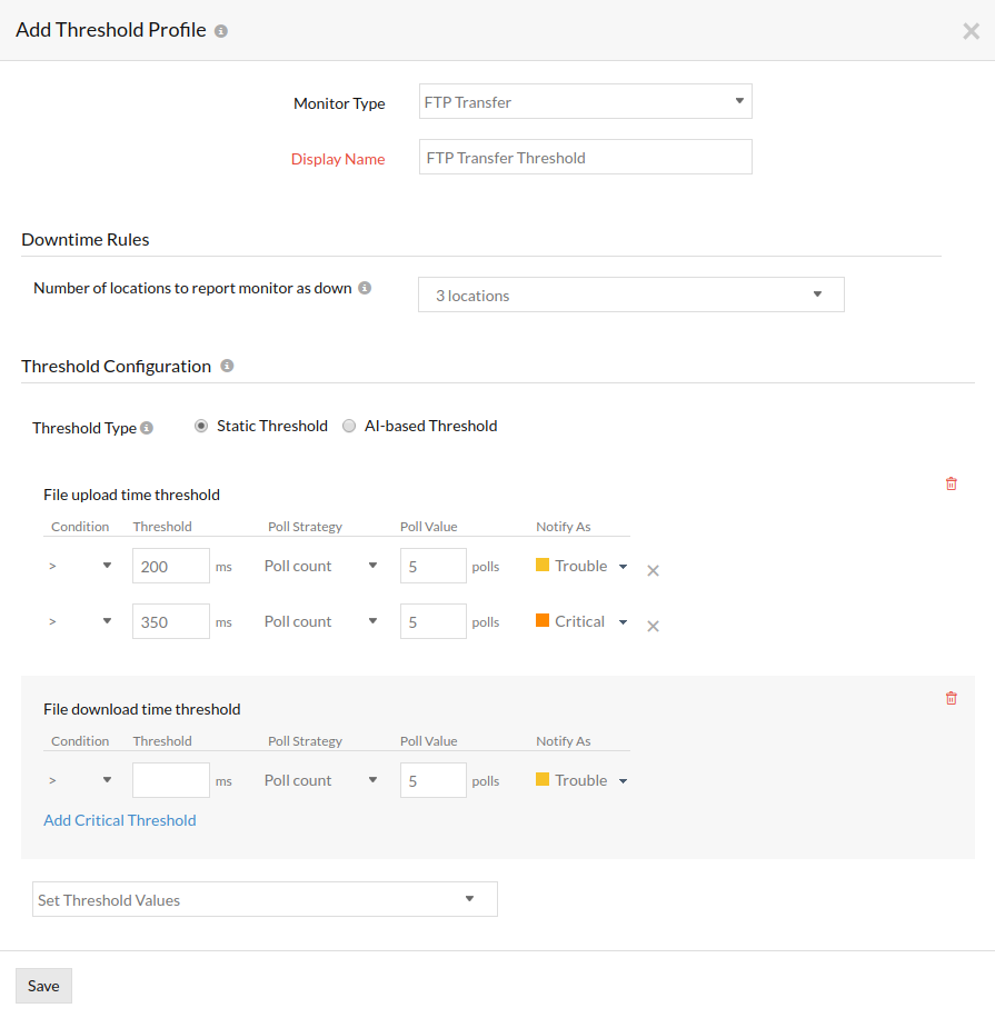 - 下载时间阈值:指定文件下载时间超过指定时间时收到通知的时间(以毫秒为单位)。启用切换按钮以根据您的配置获得紧急或故障通知。