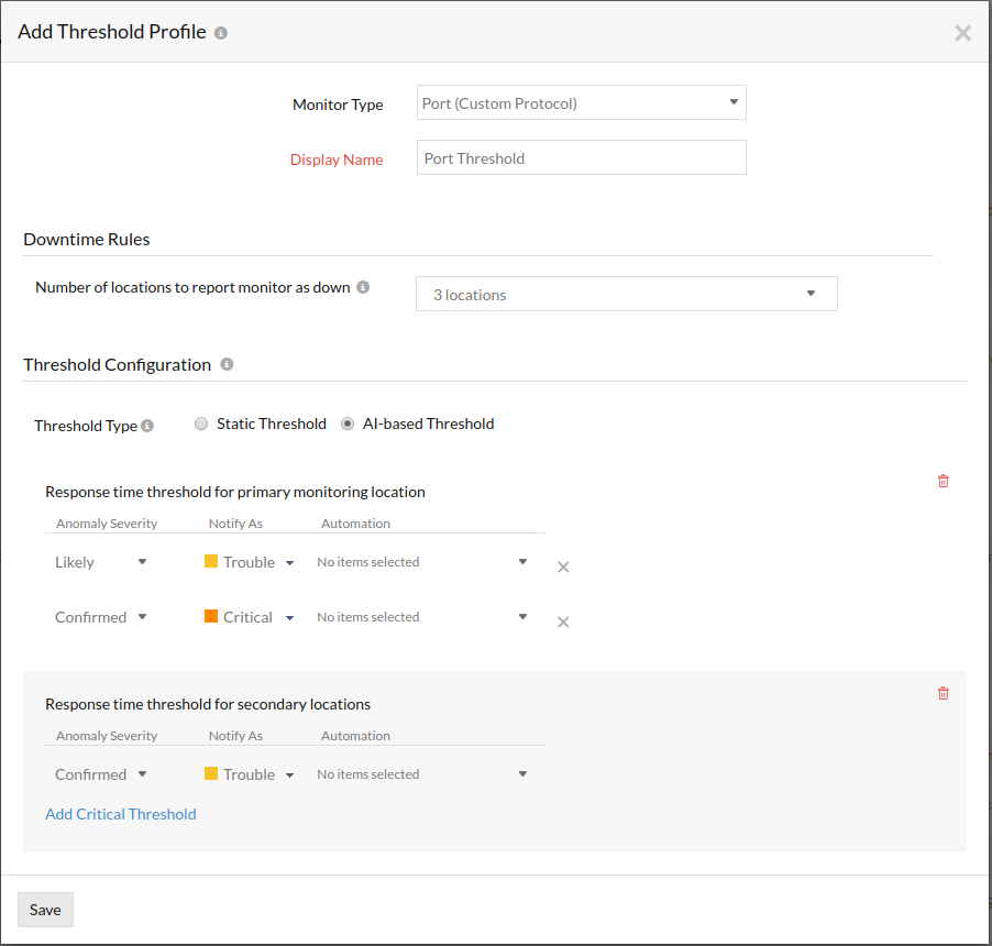 - 主要监控位置的响应时间阈值:选择异常严重性、相关严重性状态和要应用的 IT 自动化,并在出现故障或危急状态时收到通知,如果来自主要位置的响应时间有异常。