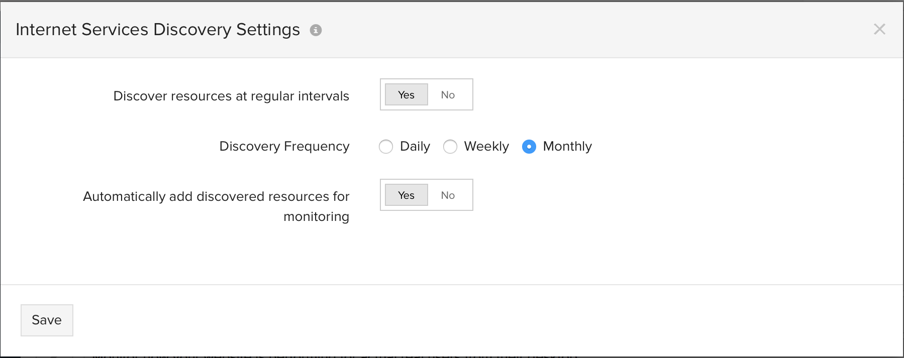 - 定期发现资源:将切换按钮设置为“是”,以启用为您的帐户自动发现新的互联网服务资源。