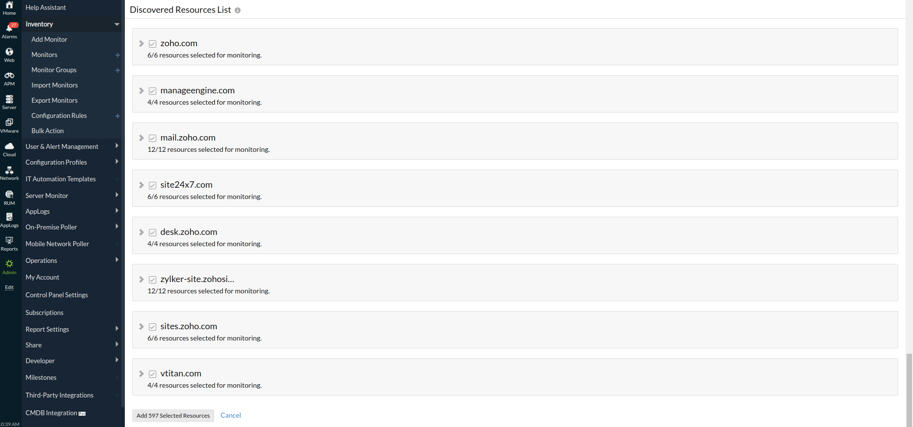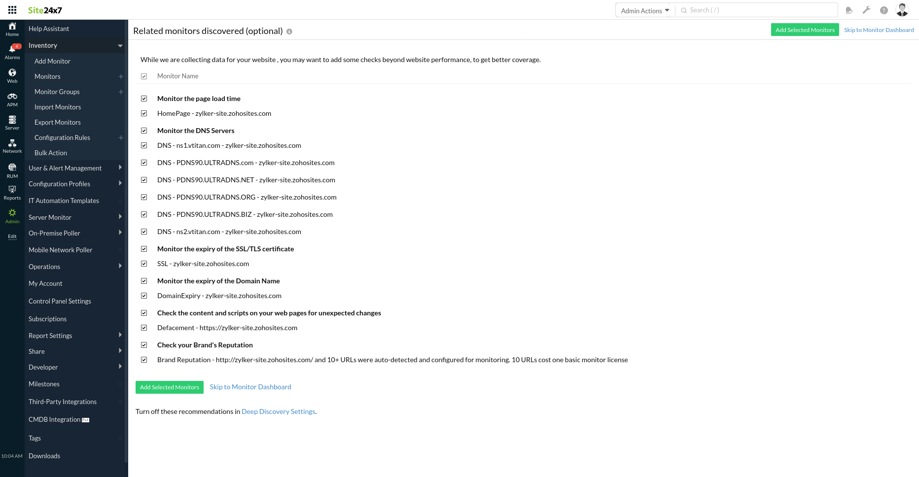 - 一旦您的监视器设置完成 - Site24x7 深度发现向导将接管 - 检测并显示您的域的所有可能的 Internet 服务资源。