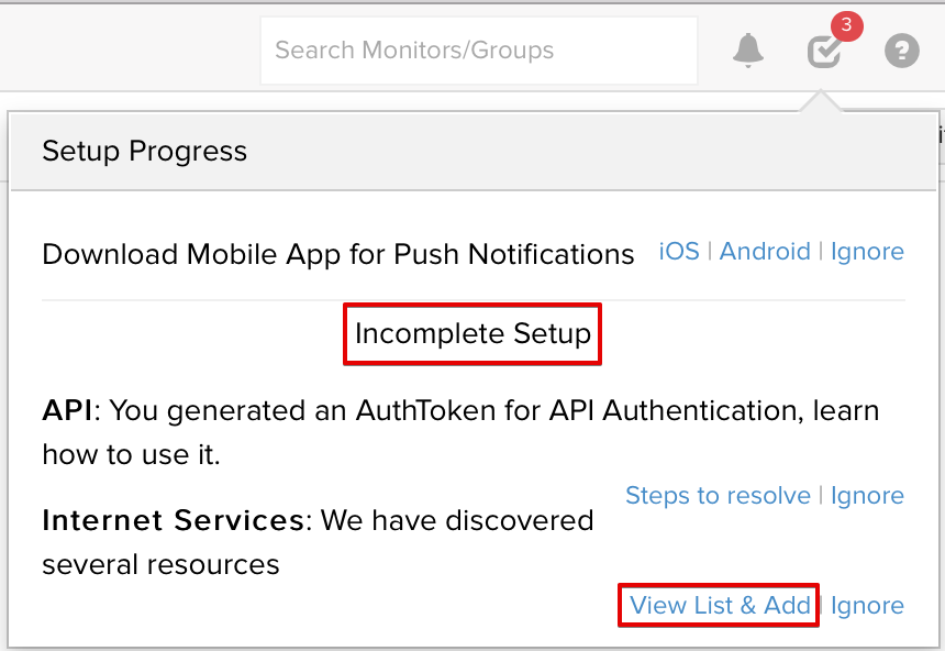 - 单击Site24x7 控制面板右上角的设置进度图标。