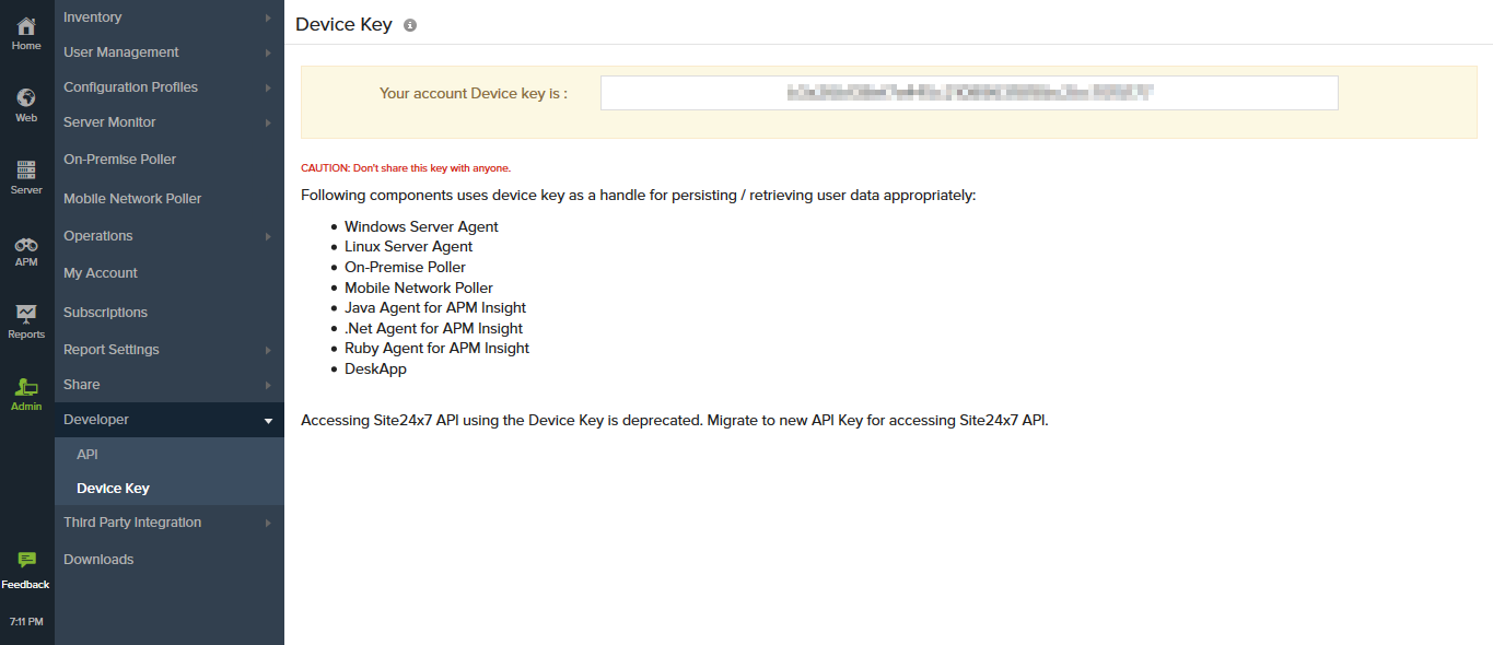 - 登录到 Site24x7 并转到管理> 开发> 设备Key。