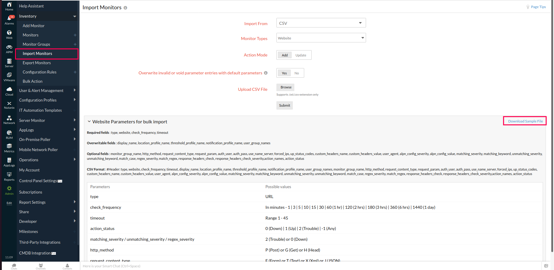 - 批量导入所选监视器类型所需的相关 参数(强制和可选) 显示在 Web 客户端的“导入监视器”页面底部。在将相关参数上传到 Site24x7 之前,您需要在扩展名为 .csv/.txt 的 CSV 文件中存储和更新相关参数。