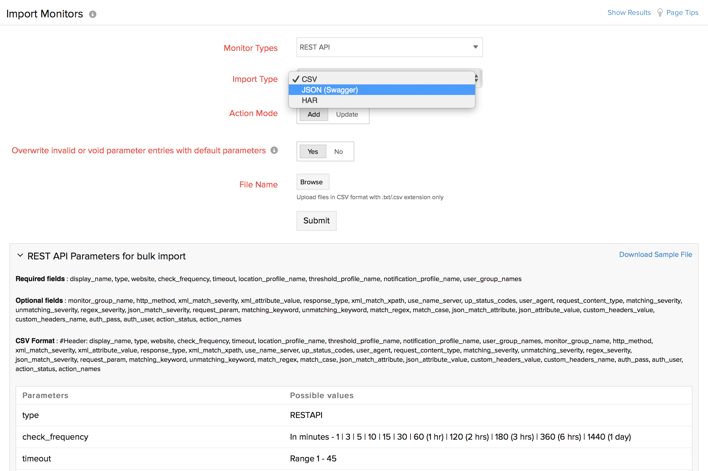 导入类型: 当您选择 REST API 监视器作为监视器类型时,您还可以选择通过 CSV/JSON(Swagger 定义)/HAR 文件导入监视器。但是,当 REST API 监视器是您的批量选择的一部分时,您可以选择仅通过文本/CSV 文件导入所有监视器。