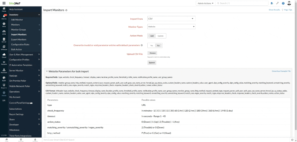 - 使用默认参数覆盖无效或无效参数条目:通过启用此选项,Site24x7 将在导入期间使用默认配置文件或参数值覆盖任何无效或无效参数。如果禁用,则 TXT/CSV 格式文件中的任何无效或无效参数都会在导入任务期间中断监视器添加。可覆盖字段将在批量导入参数部分下提及。