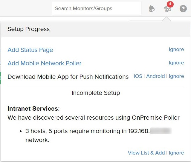 - Site24x7 Web 控制台的设置进度图标中的通知。