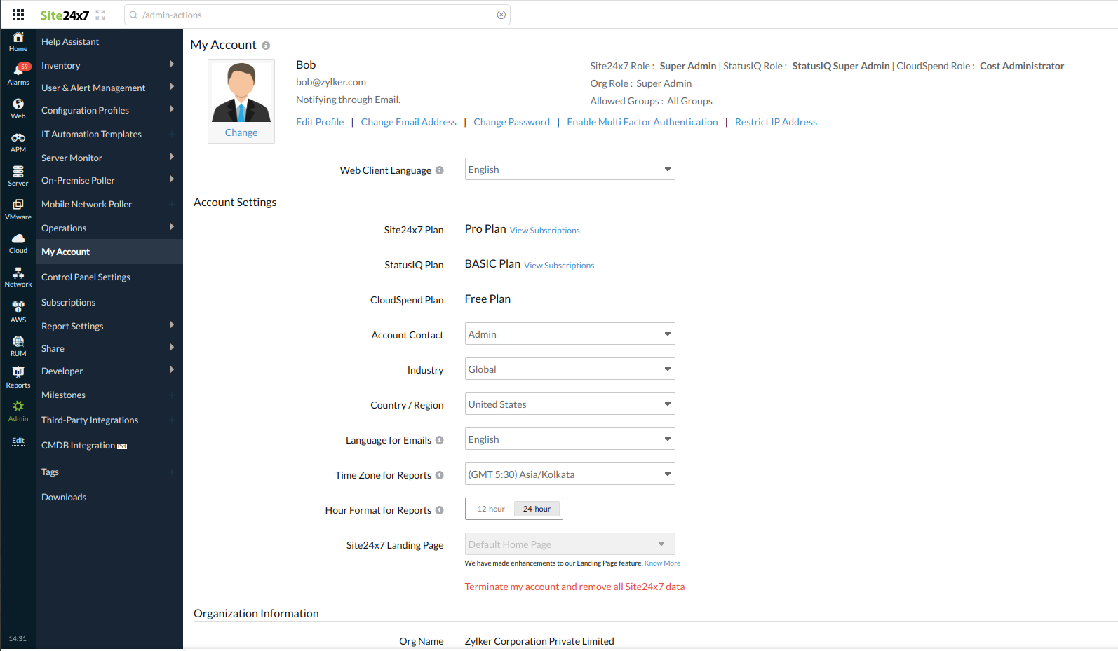 - 更新/删除组织详细信息:您可以联系Site24x7 支持以更新您的组织名称。