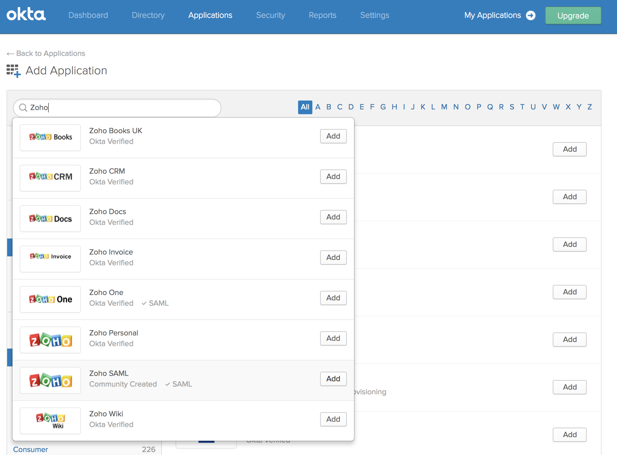- 在您的访问管理应用程序中,选择Zoho SAML。此外,获取您的配置需要的登录 URL 和注销 URL。