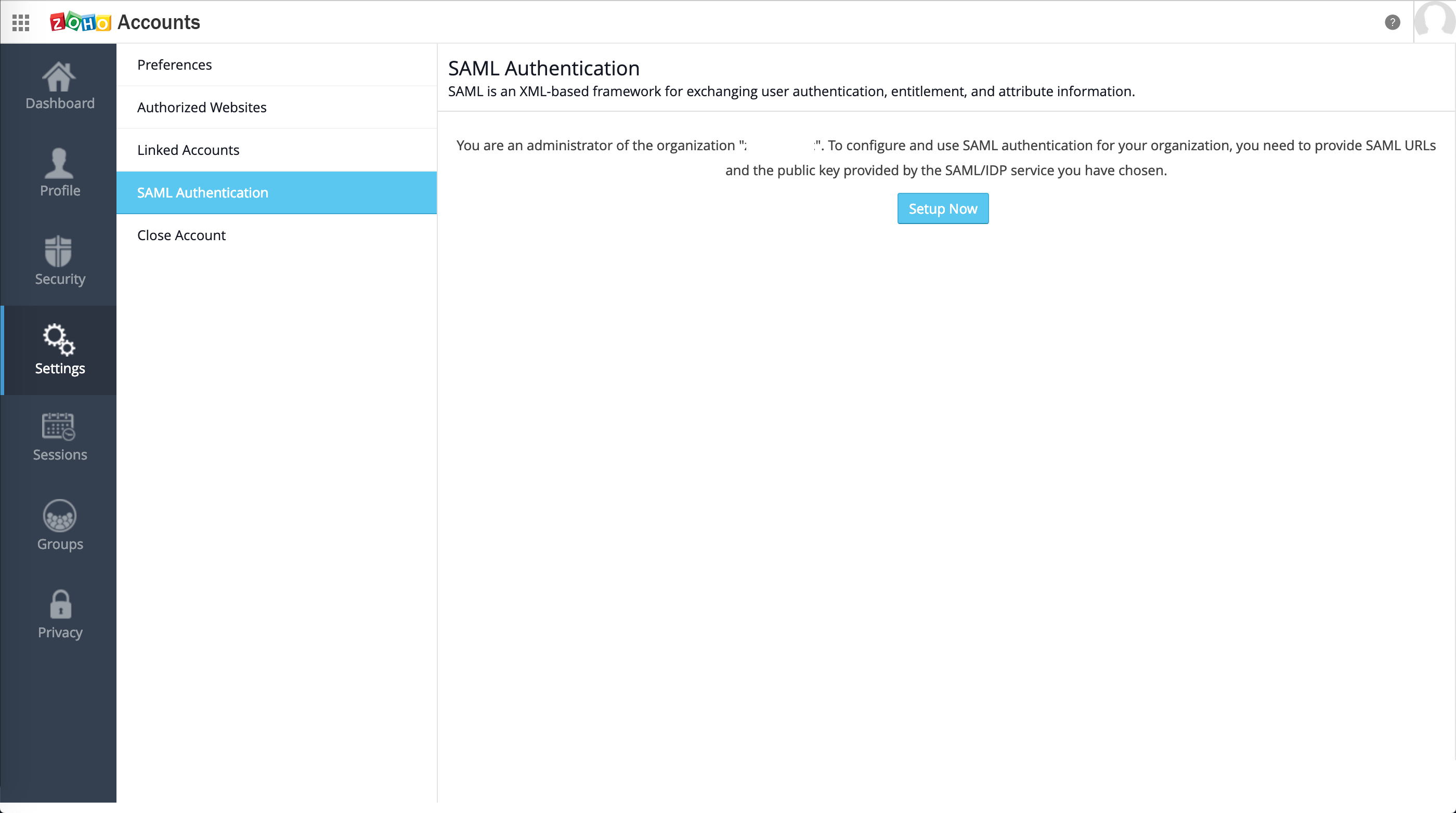 - 单击首选项选项卡 > 导航到设置> SAML 身份验证 > 立即设置。
