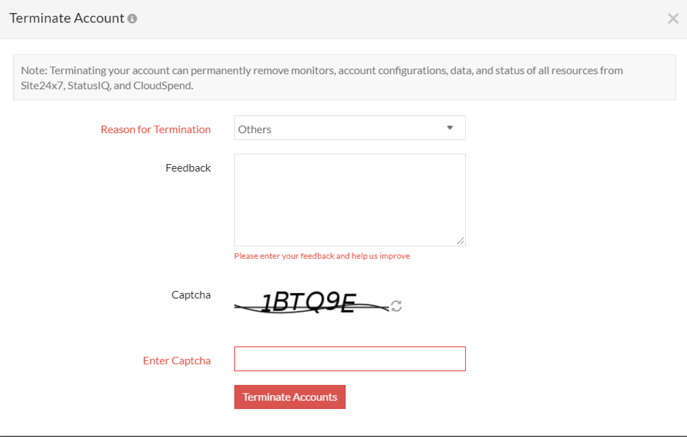- 终止帐户:此选项可用于终止您的 Site24x7、Site24x7 StatusIQ 和 Site24x7 CloudSpend 帐户。对于评估和免费用户,帐户将立即终止,而付费用户将获得三天的宽限期以撤销终止。