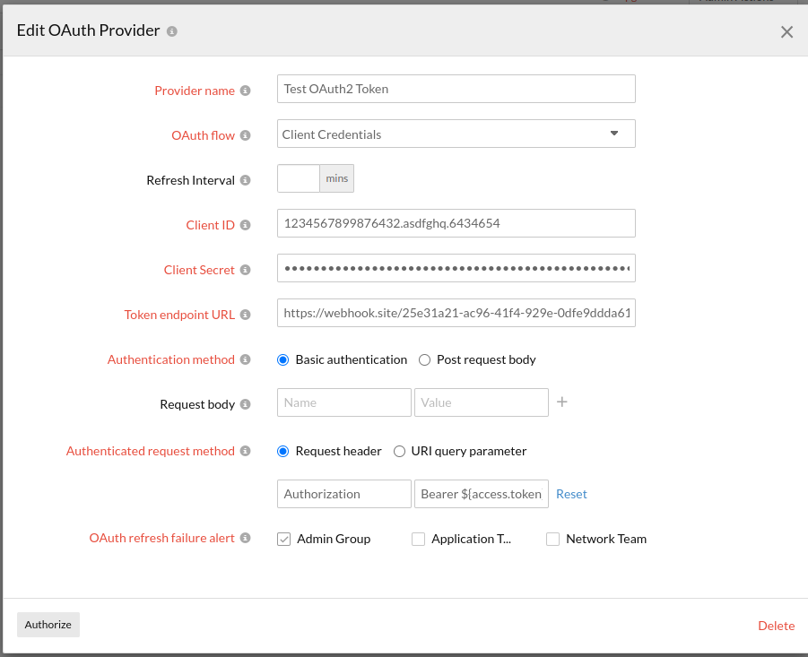 - 身份验证方法: 应用程序可以通过将其客户端 ID 和客户端密码传递给授权服务器来请求访问令牌。这可以使用 基本身份验证(其中凭证在 Authorization 标头中传递)传递,也可以发布在请求正文中。单击单选按钮以使该方法与您的偏好相匹配。